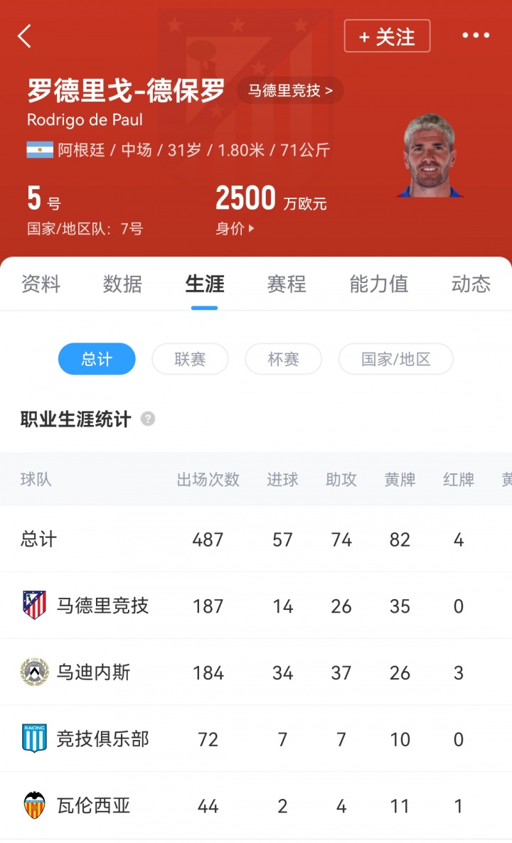 德保罗现年31岁,阿根廷中场,现效力于马德里竞技。自2021年加盟马竞以来,德保罗出场187次,贡献14球26助。国家队方面,德保罗随阿根廷队赢得了2022世界杯冠军,并获得两次美洲杯以及一次欧美杯。
